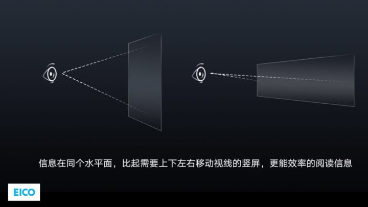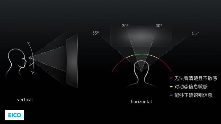 宽横屏虽然更符合人类视角,但人眼视角的辨识度是有限的。30° 视角内,能够正确辨识信息;55° 视角内,对动态信息敏感;但对更远距离的信息,人眼将不再敏感。