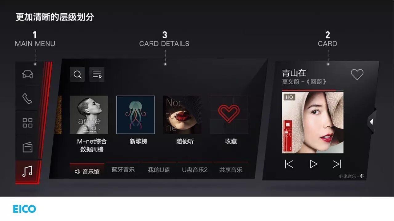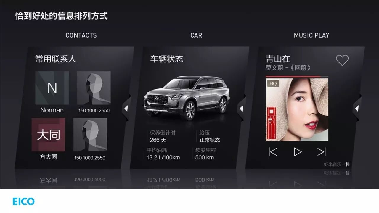 行车环境中,驾驶者的注意力是有限的,为了帮助驾驶者更迅速、准确地获取信息,设计师谨慎思考,模拟真实驾车环境,不断尝试,设计出了更适用于车载系统的信息密度。