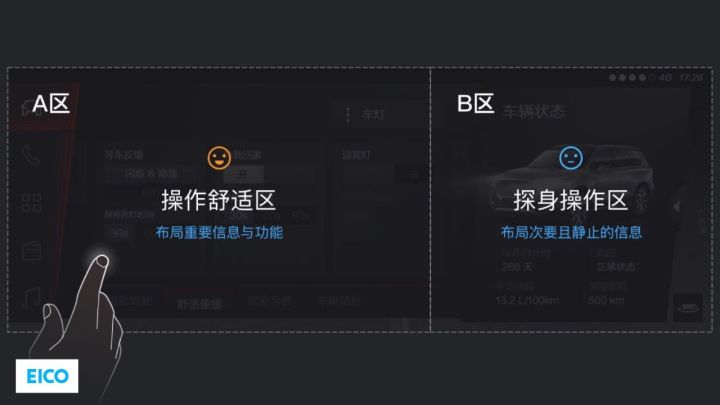 设计师面临的问题是如何保证宽横屏车载系统的易用性,减少驾驶者浏览信息产生的疲倦感,避免探身操作,同时又不浪费最佳视角外的屏幕空间。根据屏幕尺寸,我们将屏幕划分为 A、B 两个区域。A 区占整块屏幕大约 60% 的面积,重要信息与操作必须位于这个视线可达、操作可达的 A 区;而不适宜视线长时间驻留、且需要探身操作的 B 区,则布局非重要的辅助信息,这是贯穿整体设计的重要原则。