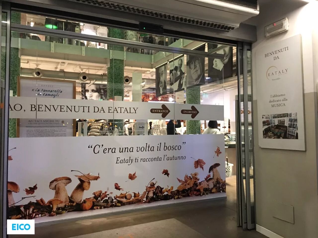 店铺自动门上面写着“欢迎光临”,合起来的时候是一张大海报,上面写着“ C’era una volta il bosco,EATALY ti racconta l’autunno ”的意思是“从前有一片森林,让 EATALY 告诉你关于秋天“。
