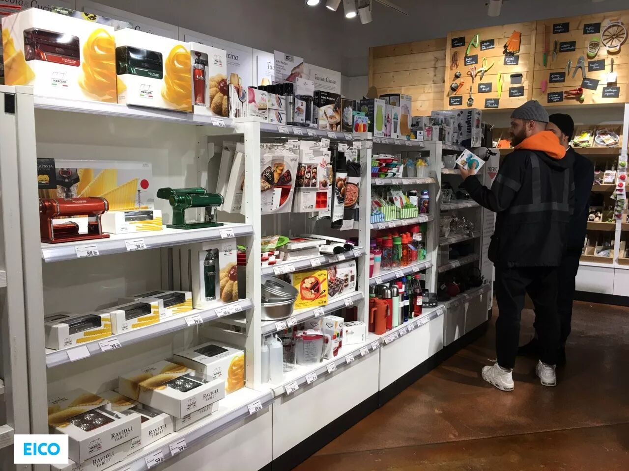 一层还有一片区域看起来像普通超市,这片是售卖袋装食品、烹饪工具、生活用品、洗化用品的,这里的商品也经过了精心的挑选,是符合 EATALY 原则的商品。这一片陈列使用白色约 1.8 米高的货架,方便顾客取货品,货架上方就做成统一的白底招牌,介绍下面的产品。