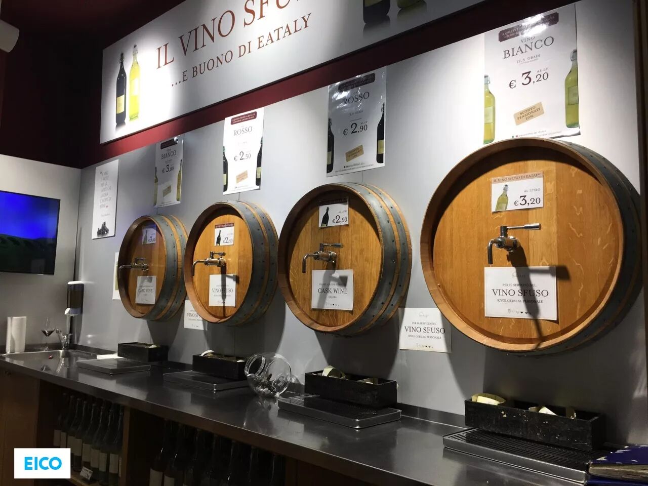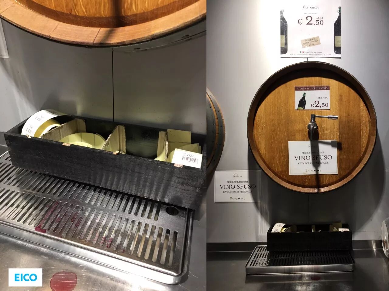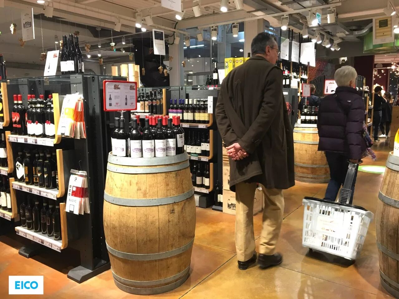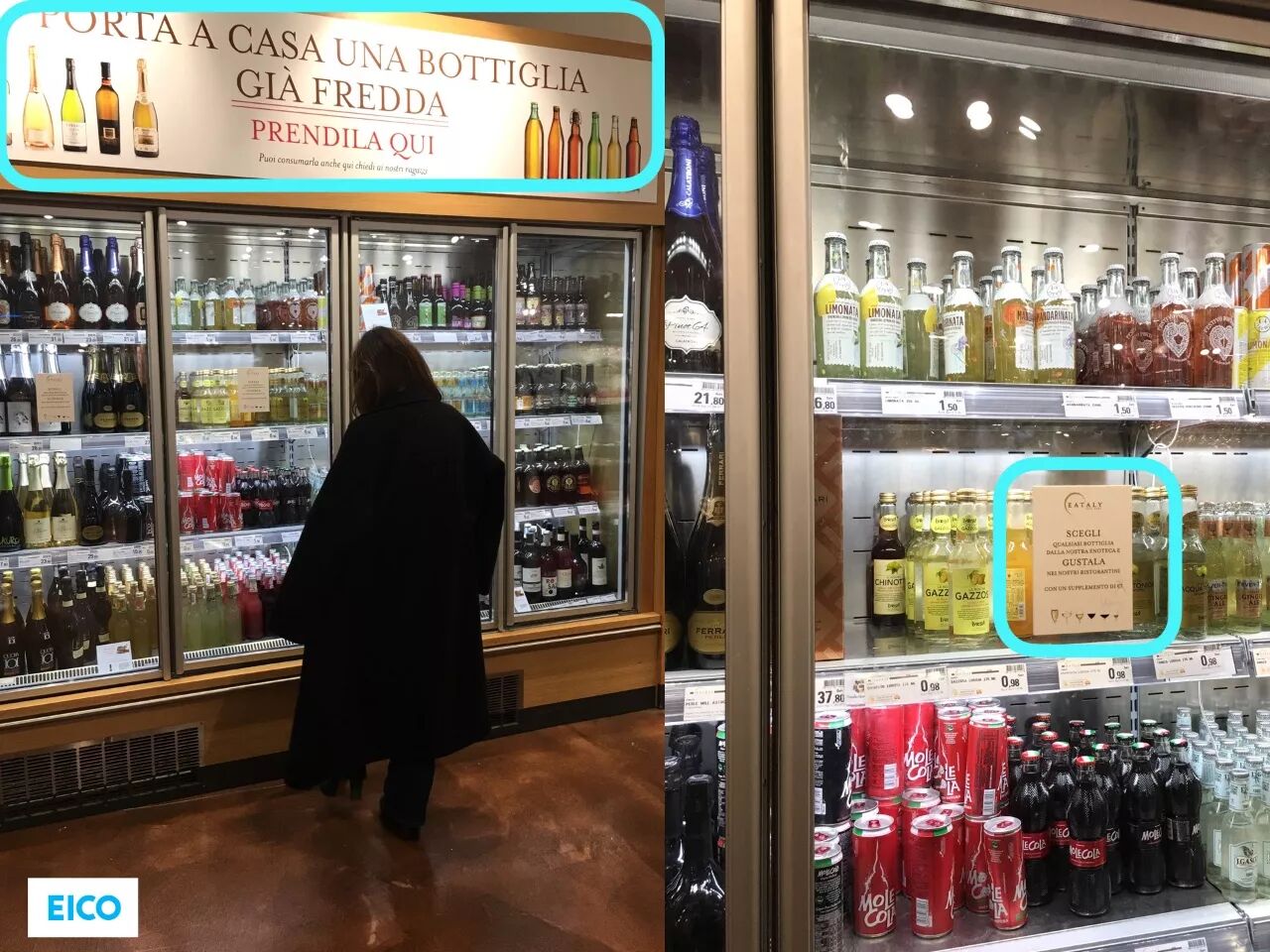 在快到一层收银处的时候,有饮料柜,上面的字意思是“拿瓶冷饮料回家吧”( porta a casa una bottiglia già fredda prendila qui ),有意思的是当你走近饮料柜,玻璃柜门上的纸写的是“如果您在店内饮用可获得 7欧元的抵用券”( scegli qualsiasi bottiglia dalla nostra enoteca e gustala nei nostri ristorantini con un supplemento di 7euro)。用价格抵扣的优惠吸引了顾客在店内的停留。