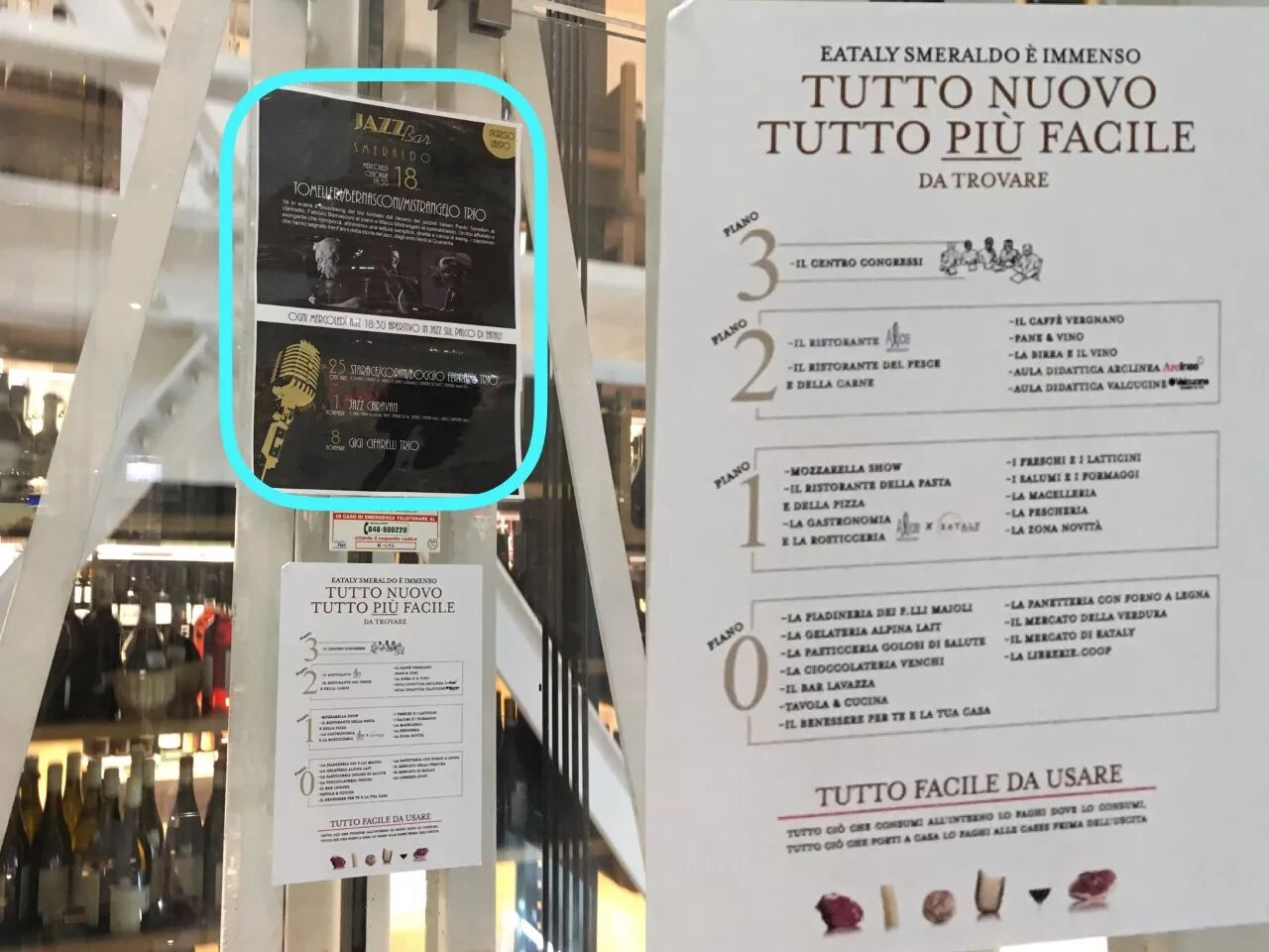 刚刚提到的二层除了售卖肉类和奶制品,也有一个功能就是音乐演出的舞台,除了 Paola Turci 在小广场的演唱会、店内的爵士演出海报、音乐家的头像海报,EATALY在入口处欢迎词下还写了一句“ l’abbiamo dedicato alla musica ”,意为我们致力于音乐。与音乐的紧密联系,让EATALY 有了与众不同的主题性质。爵士音乐节演出的音乐家头像就悬挂在入口和收银台上方,这样出入都可以看到。