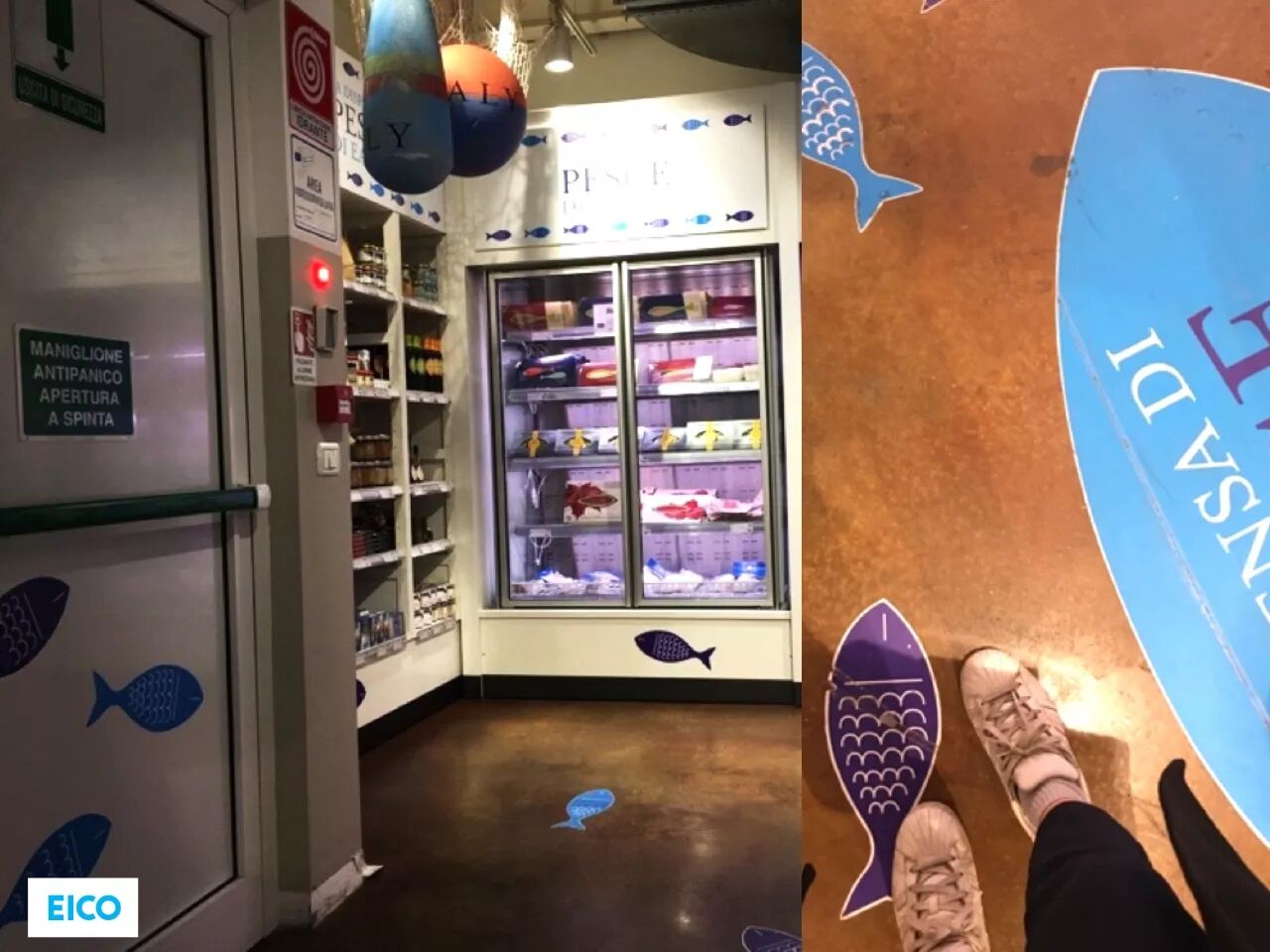 卖鱼的地方在一个角落,不容易让人发现, EATALY 使用了蓝色小鱼的地贴引导人们。一些与海有关的装饰元素比如渔网也被用来装饰。