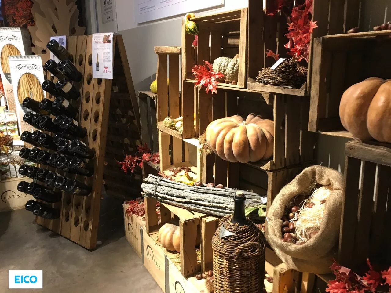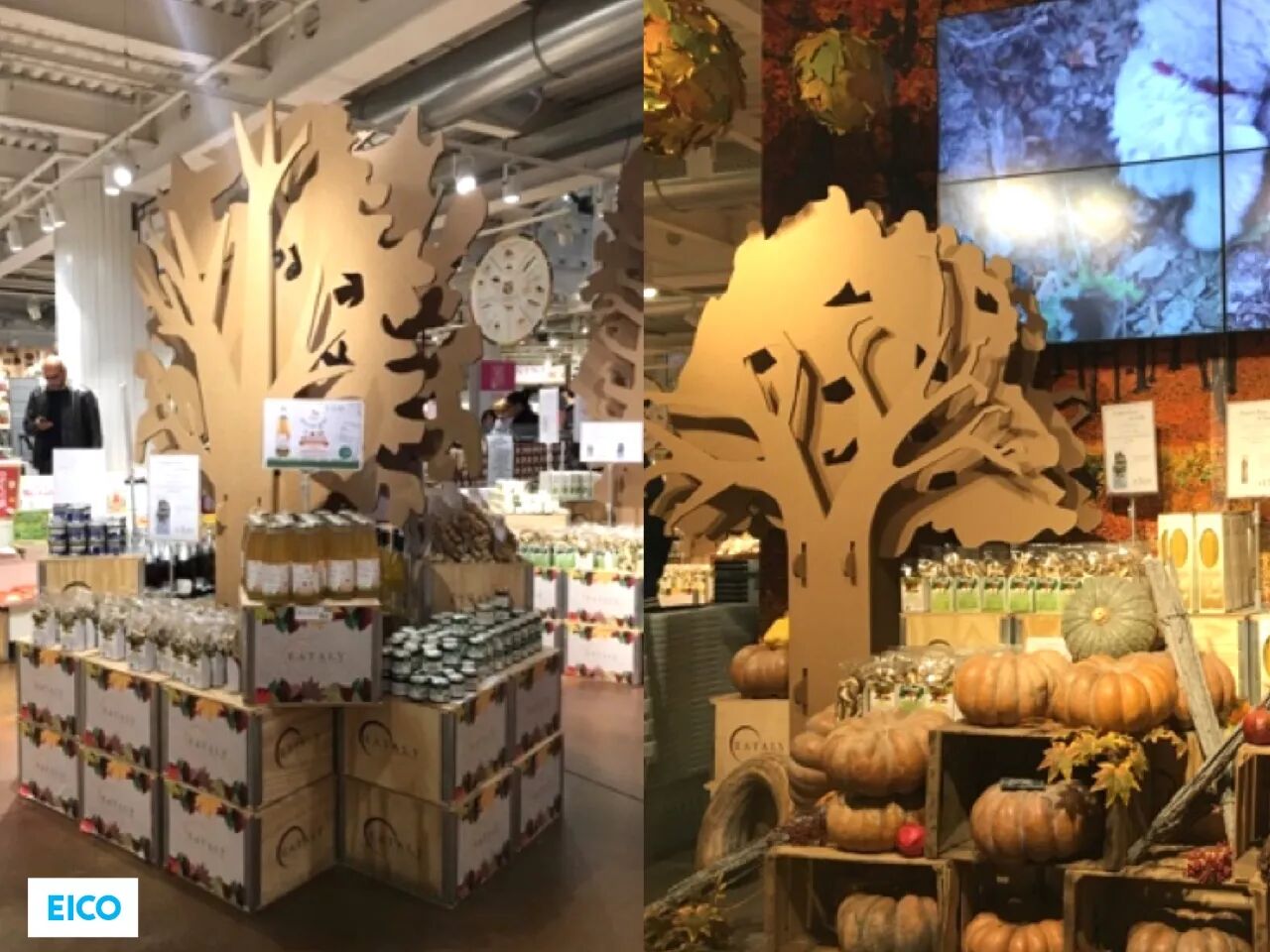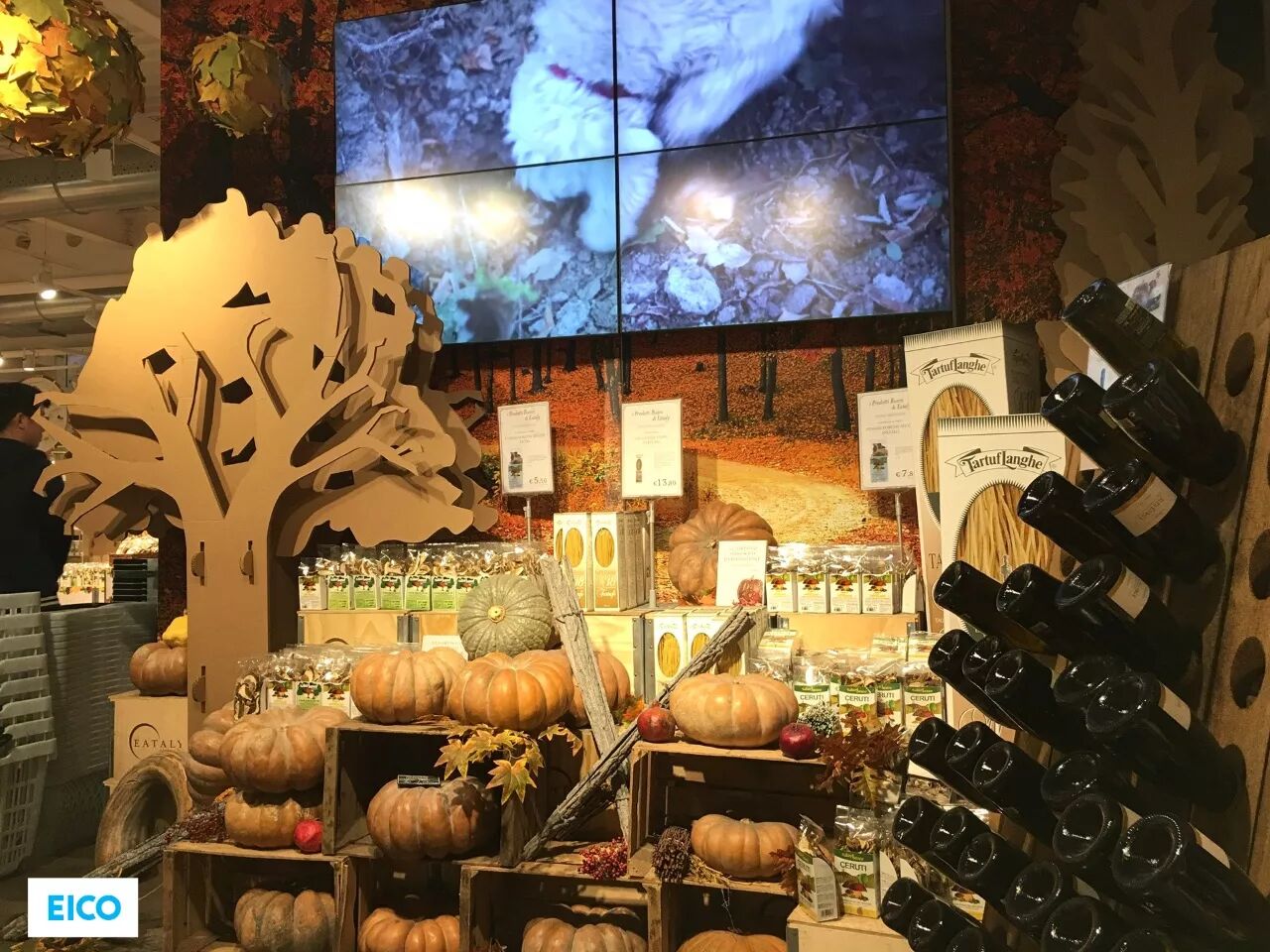 一进入商店就会看到的秋天季节主题的摆场,使用了南瓜、稻谷、树木等季节性的道具,颜色以褐色、暖橙为主。摆场背后的大屏幕在播放松露的生长和采摘的纪录片。同样醒目的还有 EATALY 自有品牌蔬果汁的展台,也使用了木头道具和 EATALY 自己的木箱,这样木箱摆场在后面会多次出现。