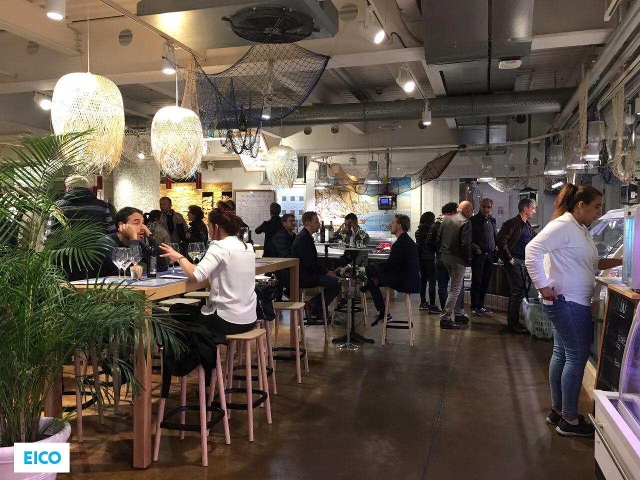而是在部分售卖区域旁边的零散区域内放置桌椅,让顾客可以休息,点菜、买食物、吃,增加在店内停留时间。如果是冷菜就可以当场吃,或者配好酒类再一起吃,如果是需要加工的食物,就等待后厨会做好, waiter 会端上来。
