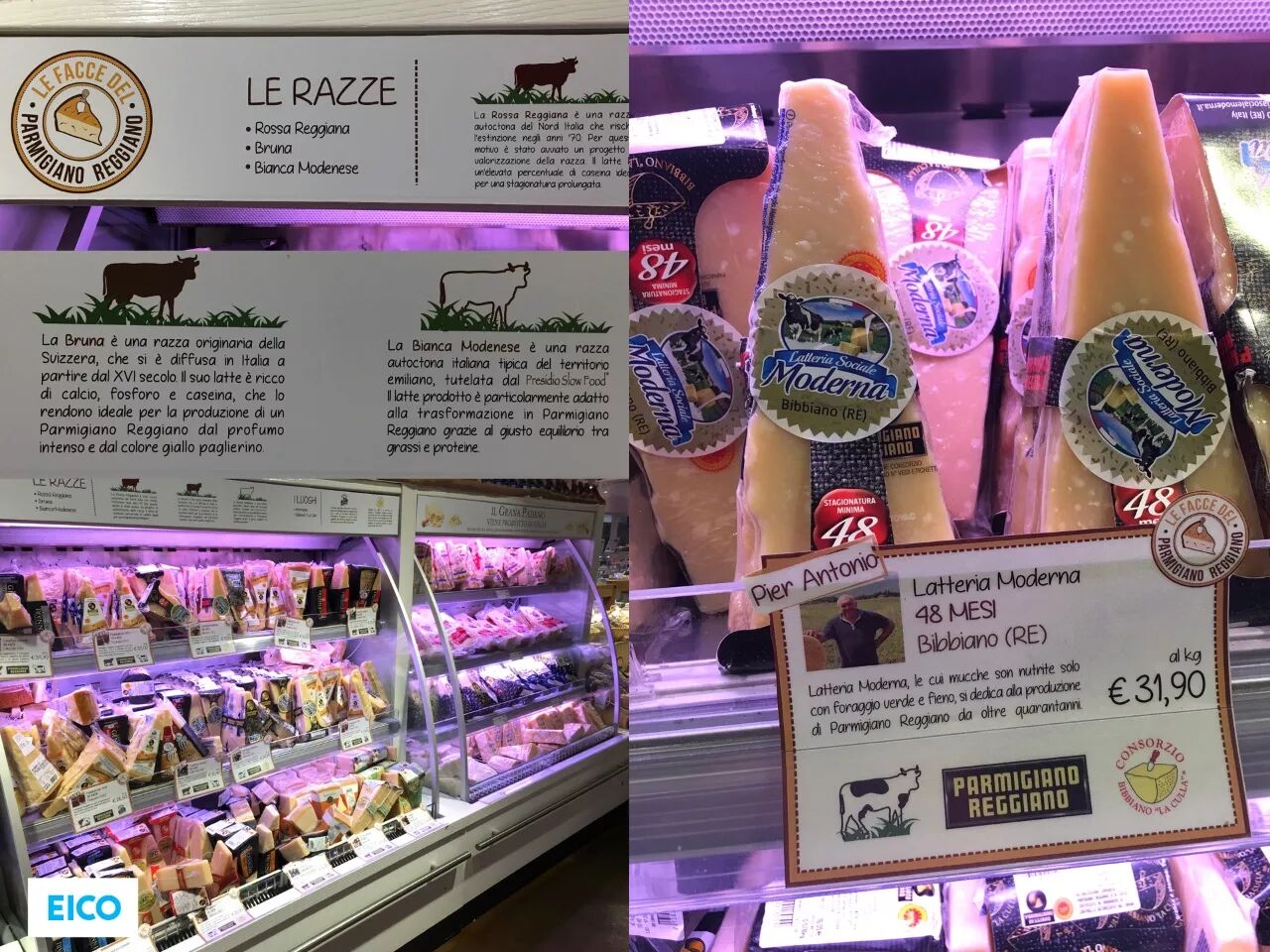 比如奶酪会显示是什么品种的牛产的奶制品、奶酪是多少个月份发酵,产地的情况、农场主照片等可溯源的产品信息。为什么信息这样全面,是因为 Parmigiano Reggiano 的奶酪的 Le Facce del Parmigiano Reggiano 这个品种只能在某些规定的地方生产,在意大利有 ParmigianoReggiano 奶酪控制局(属于政府部门)控制其制造及销售。每一轮干酪在初期成熟过程也就是当奶酪还柔软的时候就要被检验,合格之后盖上官方戳印放到存放处储存成熟。所以一定要标注日期、存储时间(图片上的 48mesi ,意为 48 个月)、生产地等重要信息。没有达到标准的奶酪则被拿去喂猪,而这些吃奶酪的猪只也就是帕尔马火腿的来源。