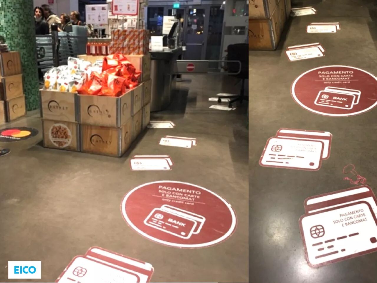 在收银台,信用卡/借记卡通道使用了地贴来告知人们这里是用卡付款的通道。