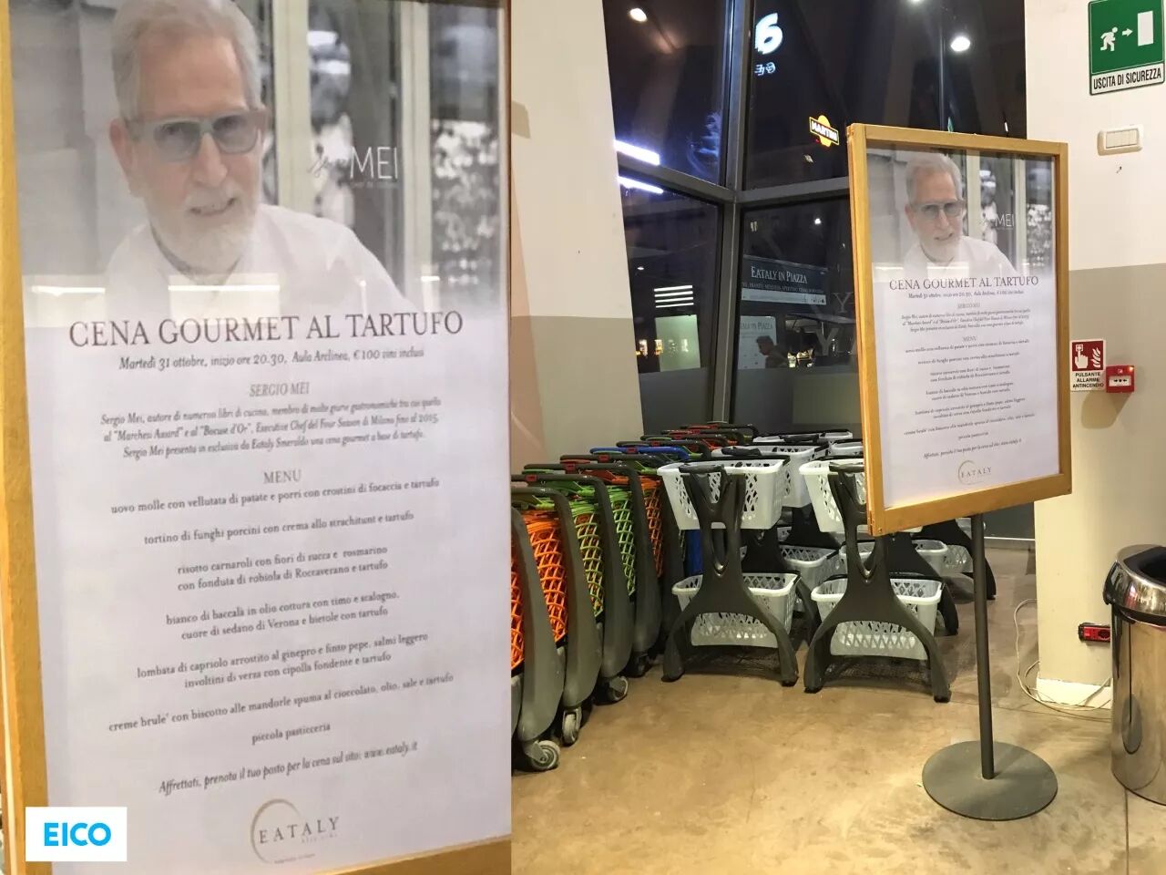 进自动门发现门旁边竖着一个小海报,上面写了“美味松露的晚餐”( Cena Gourmet Al Tartufo ),刚好和门口自动门上的海报呼应,原来是EATALY关于秋天松露活动的广告。小海报出现了主厨 Sergio MEI 的头像和介绍,给出了明确的活动信息:地点、晚餐时间是10月31日周二晚上8点30分、每位成年人 100 欧元、以及当日的菜单。