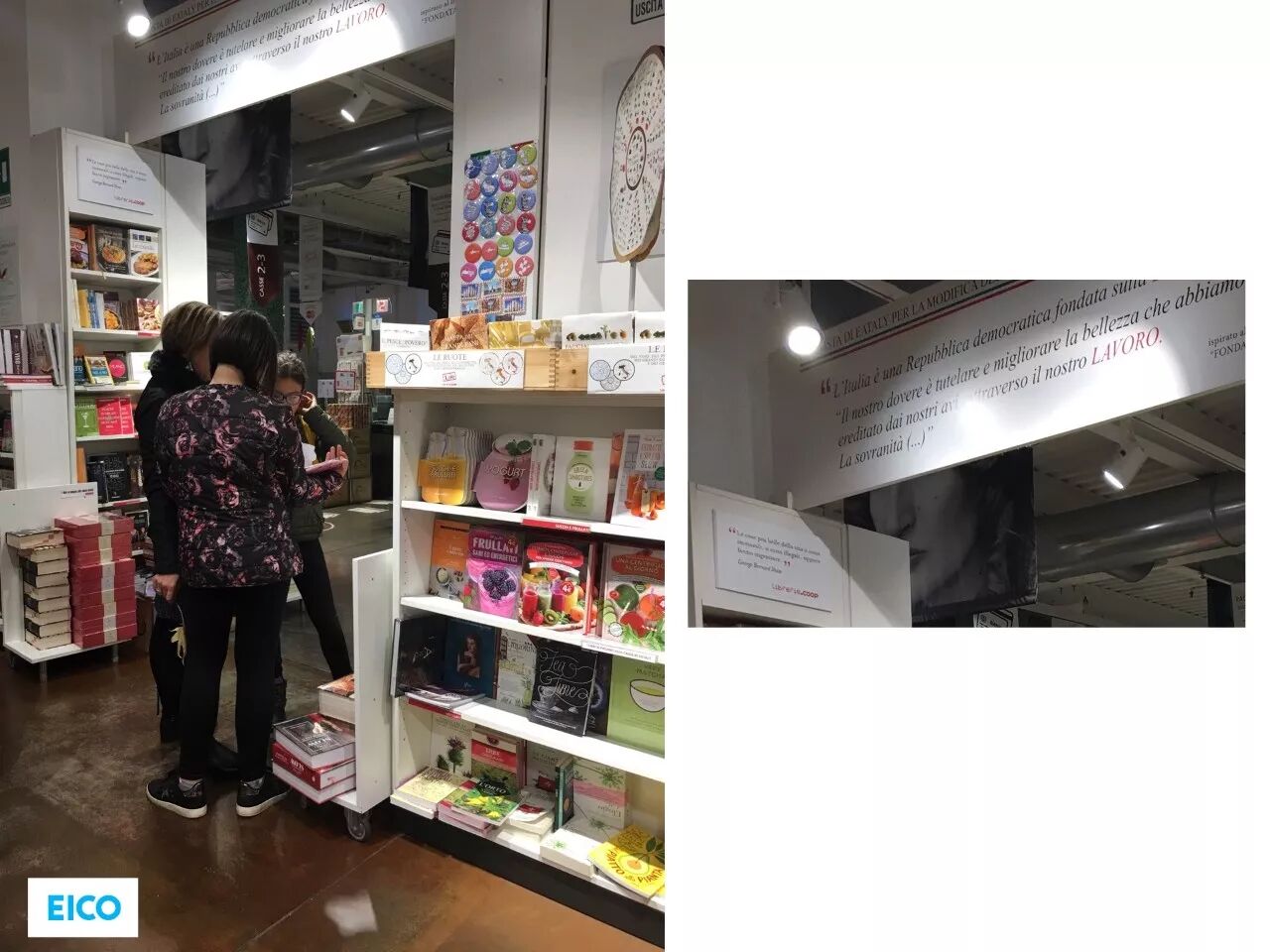 生活用品的挑选本着严格精致的要求,摆放在白色货架上,简单易被看到,图书的挑选以烹饪、生活方式、本地风俗为主题。贴在墙上的句子特别有意思,特别标注出来,上面写的大意是“意大利是一个民主共和国,我们要通过自己的劳动(被大写标红)来守护她保卫她的美丽。”旁边的诗句写的大意是“美丽的事物都是不道德的……”。这样的搭配也只有意大利人想得出来。
