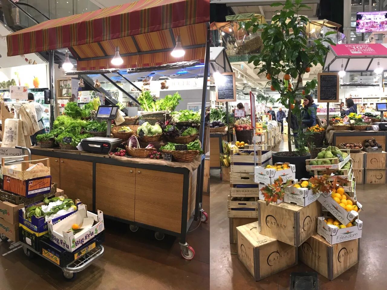 EATALY 在一层空间里使用了店铺+农夫集市+超市结合的方式,感觉好像在逛一个普通意大利街区的广场集市一样轻松。除了知名的店铺如Lavazza Bar 入驻之外,在中间使用了数个带阳棚的推车形式摆放,如果农夫们再来亲自售卖,就和周六清晨的意大利街区广场农夫集市毫无二致。