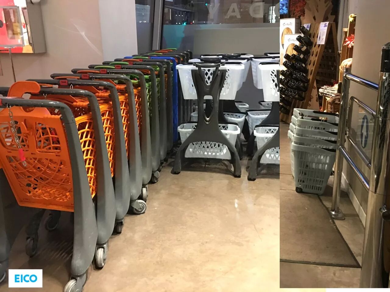 推车叠放在自动门旁边,与一般超市无异,除了大容量的橙色推车,还有放上下购物篮的两层推车,超市入口处还有一些小塑料滚轴购物篮可以在这里取用,适合进去买少量商品的顾客。顾客选择自己需要的购物篮/车买东西。
