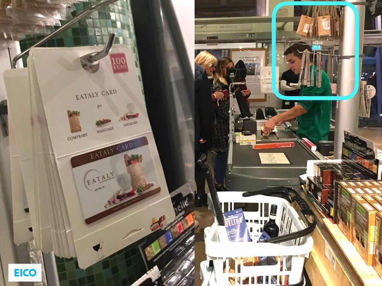 收银台前也展示、销售 EATALY 的卡,100 欧元一张,设计风格秉承EATALY的整体简单大方的原则,在这里也体现了 EATALY 的三个主张:COMPRARE 、MANGIARE 、IMPARARE ,意为“购物、饮食、学习”。