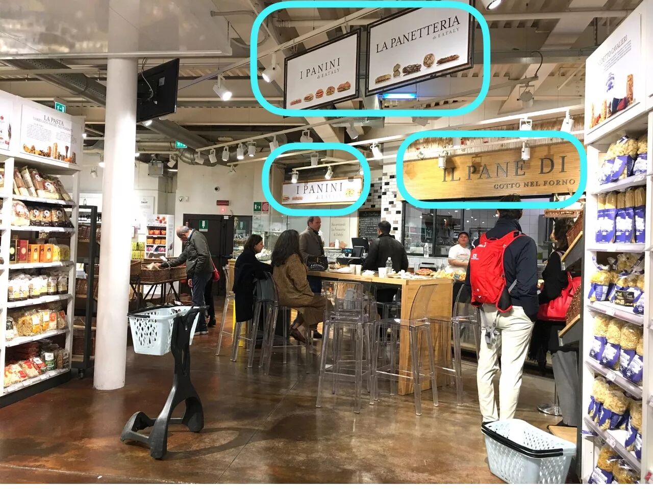 EATALY 采用自营和其他品牌商店、餐厅结合的方式营业。这些其他店铺的风格调性都在这里得到了融合,以一层面包店为例,简单清晰的指示牌把顾客指引过来:面包( I PANINI )、烘焙( LA PANETTERIA )。后面是店铺木质招牌,也符合 EATALY 的自然元素装饰的统一风格。