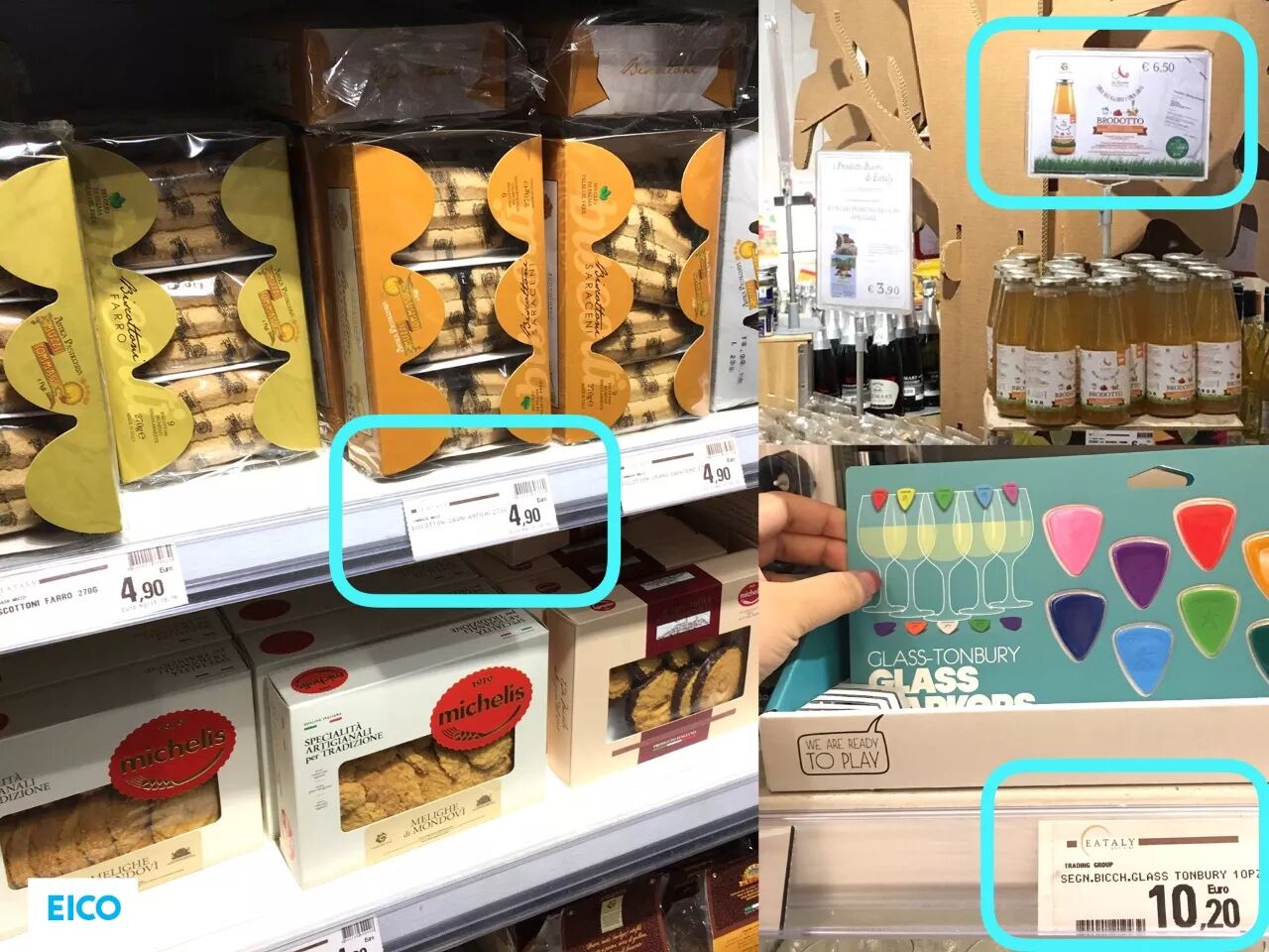 除了红框,EATALY 的打折信息也在这里体现:一个是一层卖菜小摊的阳棚上印上打折商品信息,从二楼三楼往下俯瞰就知道了打折信息。还有一个就是商品旁边的一个小小的牌子,如果不是看到上面的 -20%、-40% 的字样,根本不敢相信这么低调的牌子是写打折信息。
